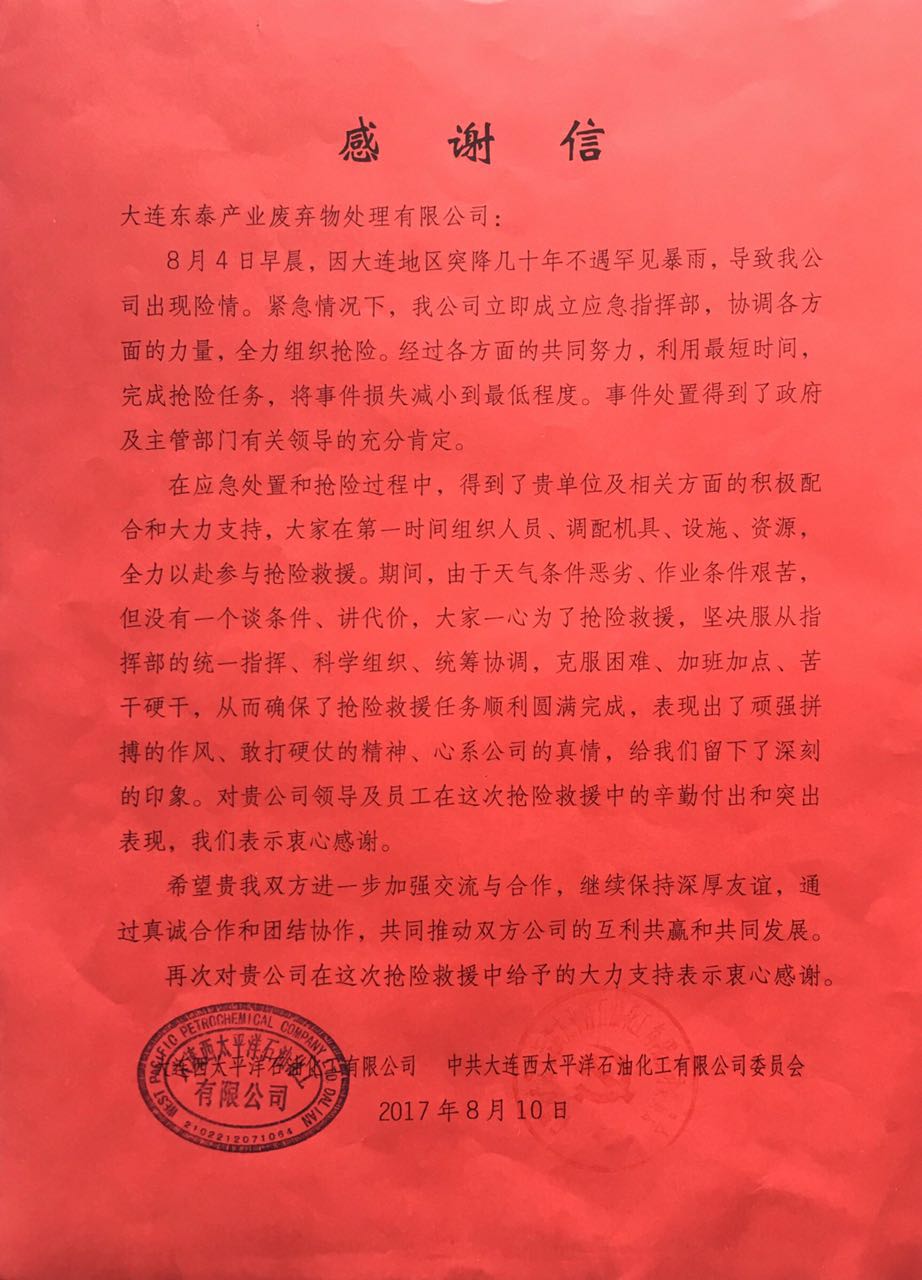 西太平洋石油化工有限公司致东泰公司的感谢信